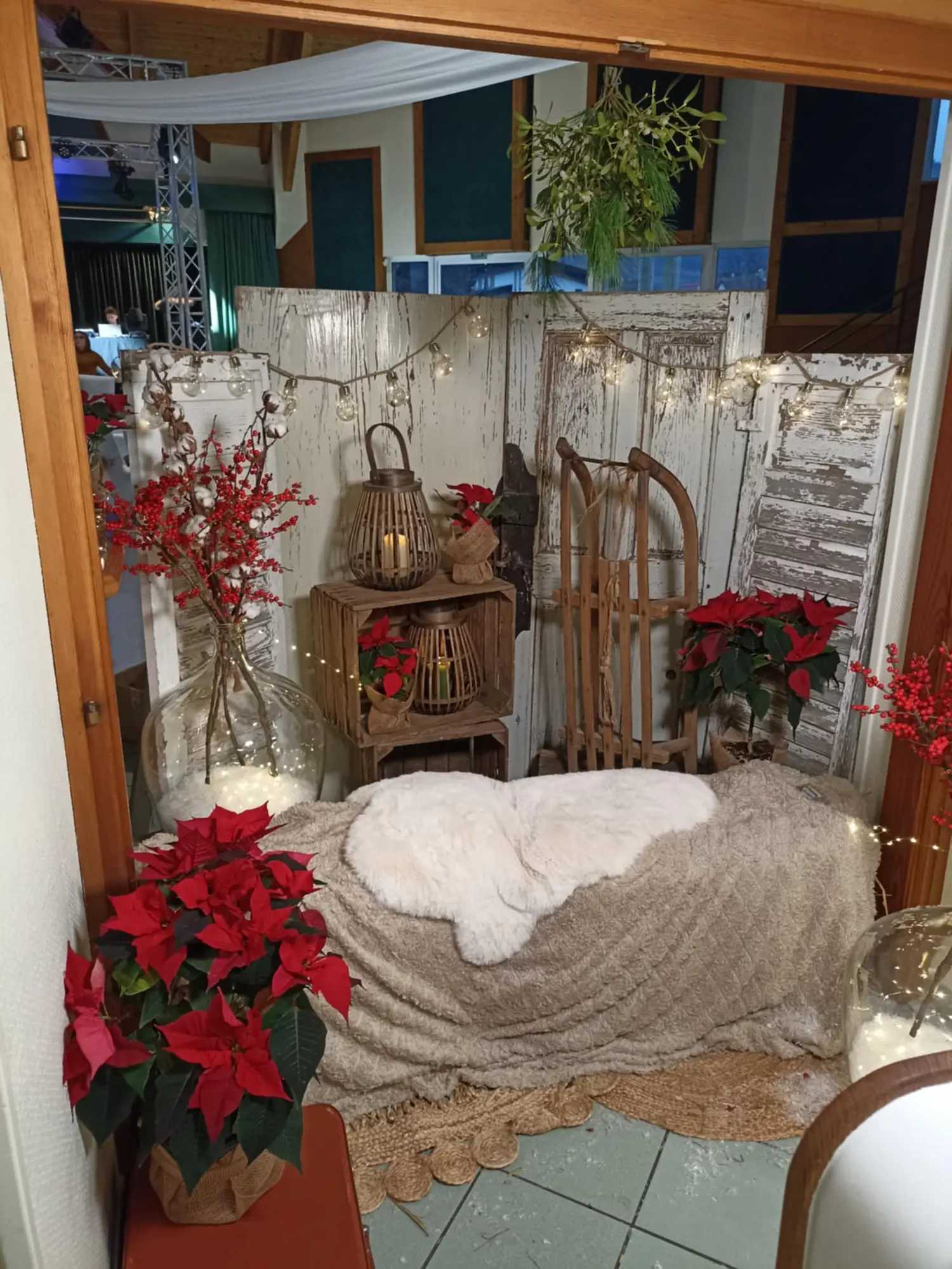 Selon l’espace – fond où le décor sera installé, je peux également installer un support avec des voilages/ rideau lumineux en guise de fond neutre, derrière les portes et volets… tout est envisageable…