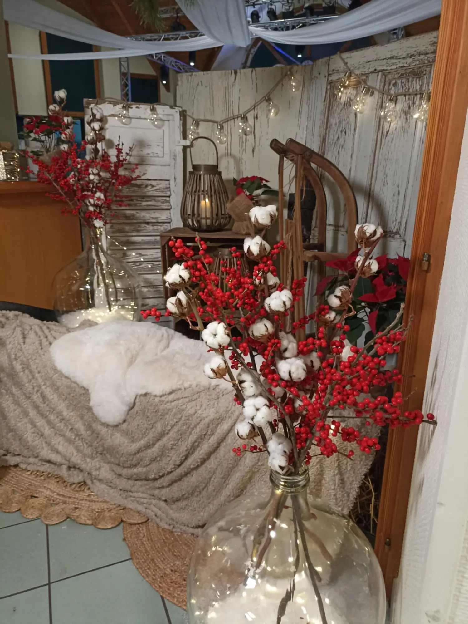 Possibilité de rajouter des bottes de pailles en guise d’assise/ banc, des couvertures, plaid… ou 2 chaises en métal couleur corail. Ou de décliner le décor en décor hivernal, féérie de Noël, après-ski…